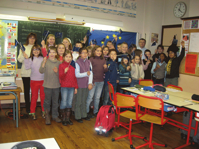 La bannière bleue frappée d'étoiles jaunes accrochée au tableau lui a permis d'expliquer les différentes étapes de la construction européenne. Les symboles comme le drapeau, l'hymne européen, la journée de l'Europe le 9 mai ont constitué autant de messages pour le respect de la paix, de la démocratie, des droits de l'homme. L'Union européenne au quotidien et notamment le respect des droits de l'enfant a vivement intéressé les élèves.