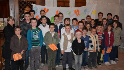 Une saynète retraçant cette partie de la vie de Jésus a été jouée par 6 enfants : Johan dans le rôle de Jésus, Anna dans le rôle de l’homme portant la cruche et accueillant les disciples pour préparer la salle du dernier repas, et enfin François, Cheyne, Laura et Hugo (de g.à d.) et dans le rôle des disciples. Une fois installés autour de la table, les disciples se questionnaient pour savoir qui parmi eux était le plus grand, et qui était le plus petit et donc celui qui leur laverait les pieds avant de manger. Car en ce temps-là, on se promenait en sandales et les pieds étaient bien poussiéreux après une journée de marche ou de travail.