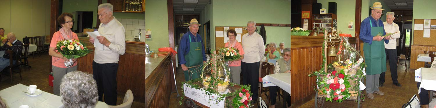 Puis place à un jardinier en chapeau de paille : Georges Schauli a composé et présenté un poème sur le thème « La kutsch », en clin d’œil à celle qu’elle utilise régulièrement. En effet, chaque mois Erna vient à la salle à pied et transporte toutes ses affaires dans une ancienne « kutsch » très pratique. Celle utilisée pour l’occasion était décorée de lierre et de fleurs, une banderole de vœux l’entourait, et un beau panier garni la complétait. La surprise était réussie, rien n’avait filtré des préparatifs, Erna Heller n’en revenait pas.